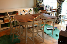 I spent hours putting a second and third coat of paint on the dining chairs and table. Sunday morning I could barely get out of bed, I was so sore from all of that stooping, squatting and bending down. So everything (except the table top) got a couple coats of fresh white paint and they look stunning! I decided to add another coat of paint to the doors of my craft cabinets while I had the paint supplies out. Check out my poor floors! They are really taking a beating with all of this indoor DIY activity. (Don't tell the hubby but I'm secretly hoping to paint or in some way refinish those floors someday.) The floors were recycled from a family members remodel that my husband helped with, by the way. I don't have NEW wood floors in the budget, but I have to tell you ~ I have a strong dislike for wall-to-wall carpet, especially of the off-white or light beige family. What can I say? I run a preschool in my home during daylight hours and children are tough on carpeting. Who knew???